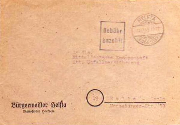 18) Briefumschlag des Helftaer Gemeindevorstehers mit Stempel des Postamtes Helfta vom 7. Juni 1948