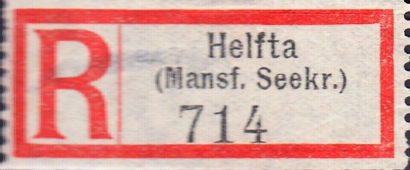 19) Einschreiben-Etikett, Reichspostamt Helfta, Mansfelder Seekreis, 1918